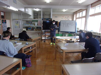 | 明日の入学式・始業式に向けて校歌の練習です。 | 大舘校長先生より、学校教育目標の説明がありました。 |