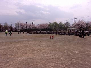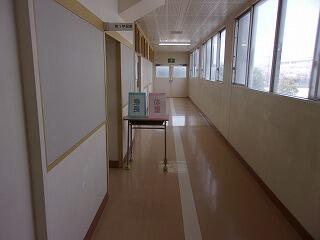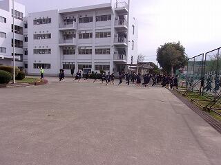 | こちらの教室の中で身長・体重測定をしています。 | 避難訓練、校庭に避難途中の様子です。 |